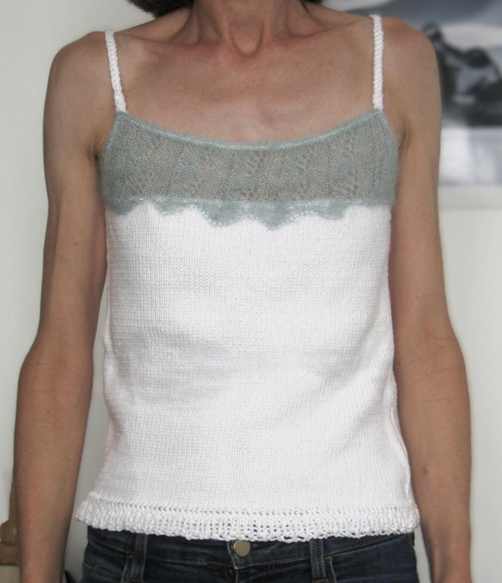 Le coton un peu épais de notre top en dentelle Astrel est très résistant. La dentelle en mohair et soie (77% super Kid mohair, 23% soie, fil produit en France) a un aspect lumineux et un peu duveteux tout en étant extrêmement durable.